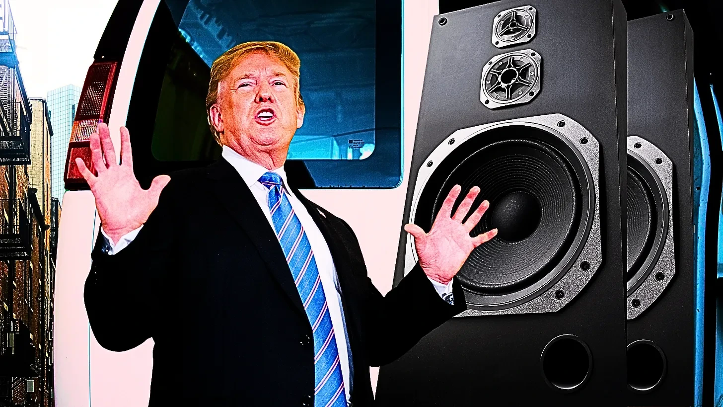 “The sound quality is like nothing you’ve ever heard before,” the Republican nominee for President said, referring to the matching set of large jet-black speakers displayed from the rear of the white, unmarked, commercial-grade vehicle. “The biggest, most beautiful sound in the world.”